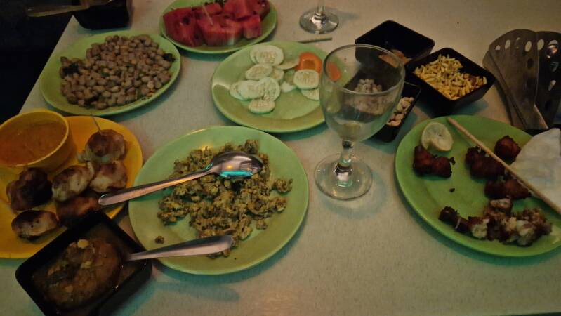 Even later kwamen er nog vijf borden met van alles om te knabbelen. We wilden de ober wegsturen: we hebben niks besteld. Maar nee, dit was gratis, bij de drankjes. Nog wat later kwam er een bord gebraden stukjes kip. En nog weer later vada met sambar (een soort oliebol in dunne kerriesaus). Inmiddels hadden we onze cocktails op en zaten we verbluft naar die hele tafel vol met eten te kijken, waar we niet om gevraagd hadden, en wat we ook niet wilden opeten. En vlak daarvoor hadden we op straat een deel van onze net nieuw gekochte banaantjes uitgedeeld aan bedelaars. Soms zorgen de tegenstrijdigheden hier in India voor kortsluiting in je hoofd.